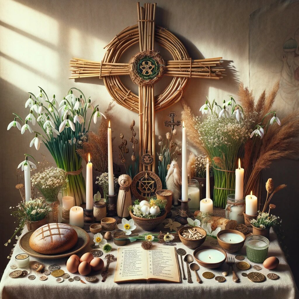 - Création d’un Autel : Préparez un petit autel avec des objets symboliques pour Imbolc, comme des bougies, des fleurs blanches, et une représentation de la déesse Brigid.